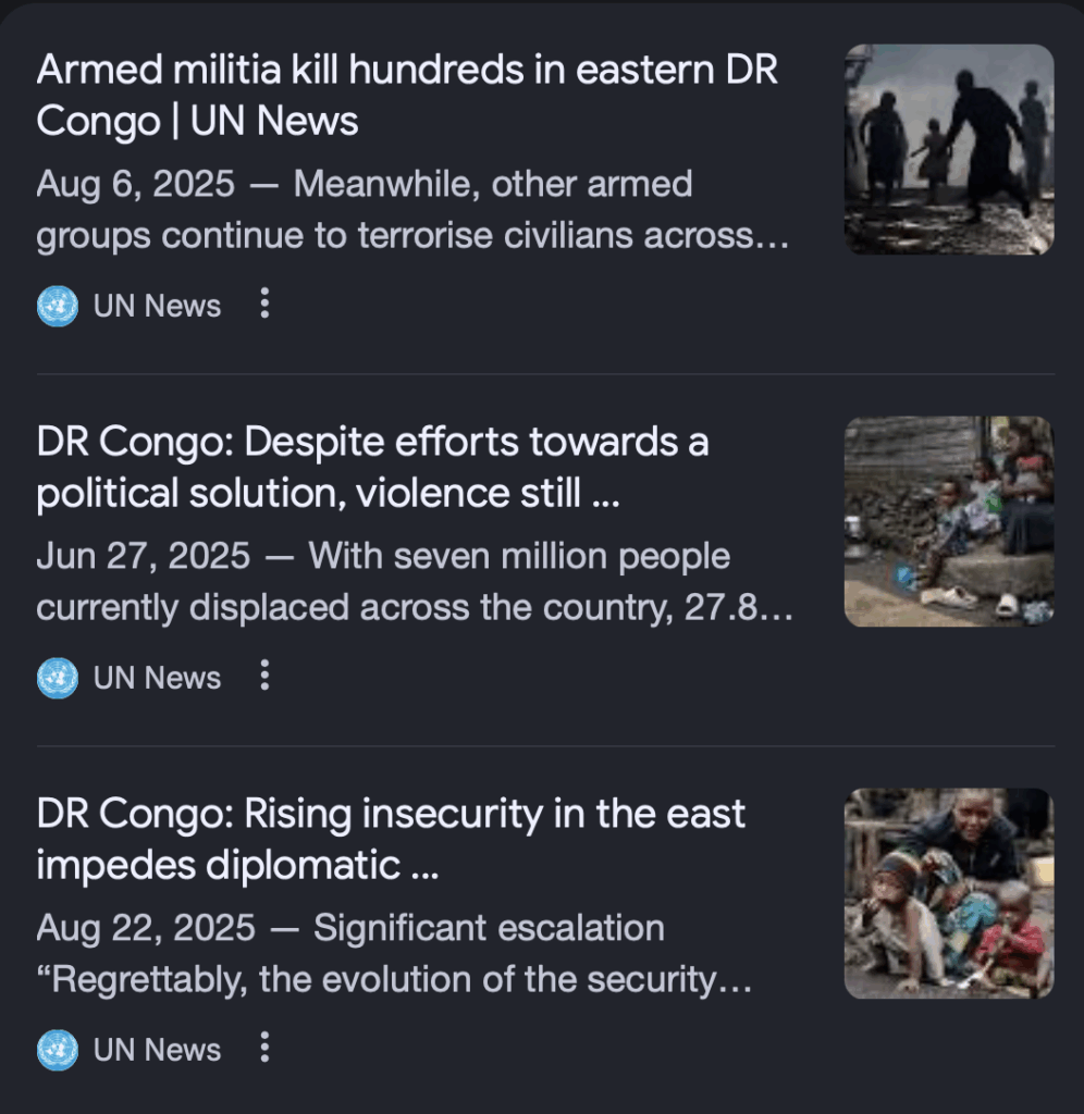 The image above is a snapshot of recent internet headlines on eastern DR Congo.